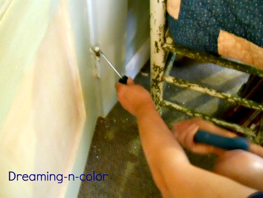 I took the pins out of the hinges with a hammer and screwdriver. It was real simple and we will use the door in the bathroom for display.